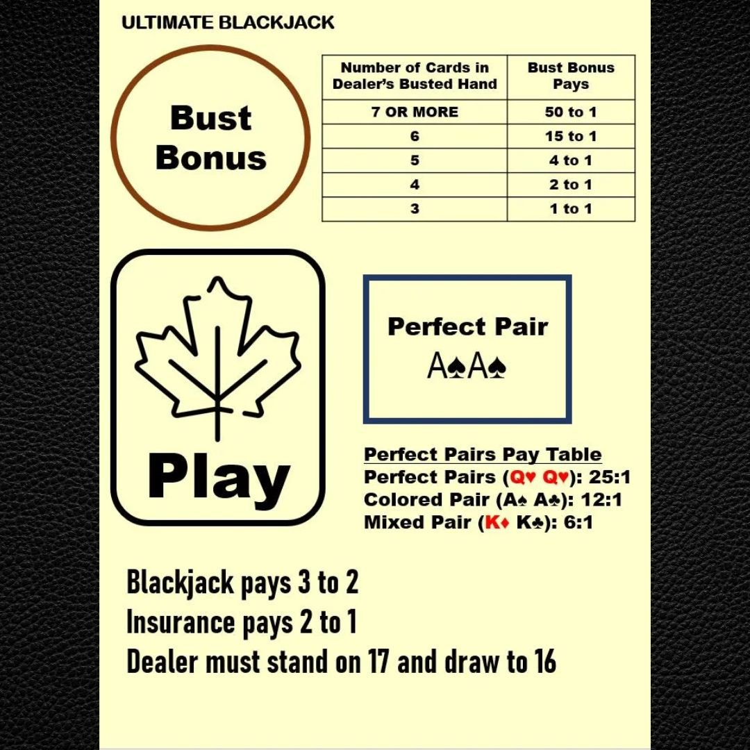 Bust Bonus: Get paid extra when the dealer busts! The payout is higher depending on the number of cards the dealer took before busting.